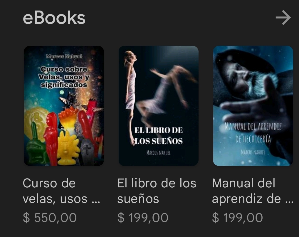 Los libros de Marcos Nahuel, disponibles en formato digital en Google Play Libros, son una excelente opción para aquellos interesados en la magia y el ocultismo. Entre los títulos ya disponibles se encuentran “Curso de Velas: usos y significados“, “Manual del aprendiz de hechicería“, ” El libro de los sueños” y “La reencarnación: todo lo que debe saber sobre sus vidas pasadas“, entre otros.